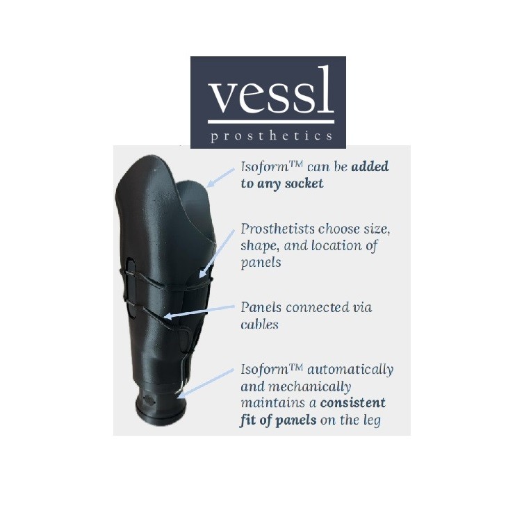 Vessl has developed a new prosthetic socket designed specifically for amputees who have struggled to find a good fit with traditional sockets or who have felt that affordable options were not available to them. Vessl’s socket is the only socket that automatically adjusts as amputees’ legs change size. Custom panels maintain a consistent, clinician-set level of pressure on the leg even as the leg shrinks and swells. This socket is compatible with standard connectors, so prosthetists can easily integrate the Vessl socket with any shank and foot they choose. Vessl’s socket can be worn every day without pain or the need for prosthetic socks.